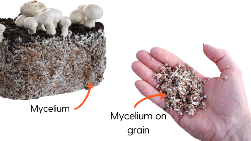 The mycelium of a fungus is everything but the fruiting body. It is a network of very thin threads, called hyphae (the singular is “hypha”), that grow throughout the substrate, feeding and carrying on whatever other business the fungus has (when hyphae from two different individuals meet, they may mate, for example). Mycelium is usually white, though other colors, such as pink or black, are possible. Usually the strands are too thin to see without magnification, though heavily colonized substrate may be visibly whitened (or made pink, or whatever other color).