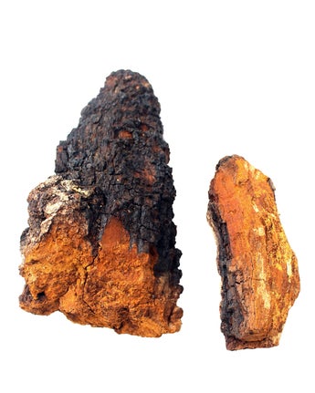 Chaga produces a woody growth, or conk, which looks similar to a clump of burnt charcoal — roughly 10–15 inches (25–38 centimeters) in size. However, the inside reveals a soft core with an orange color.